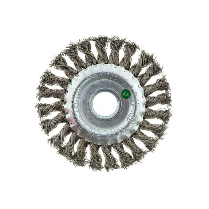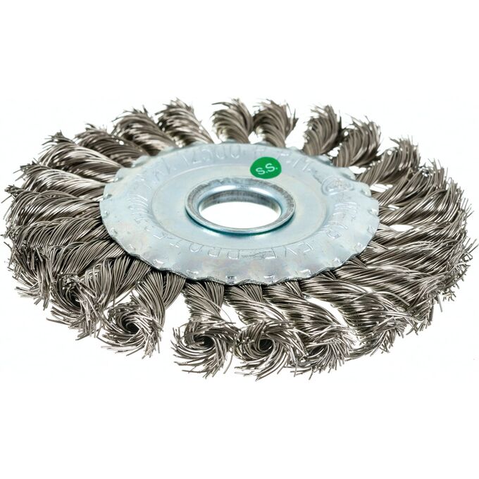 Щетка дисковая жгутовая 13-031 125 мм; 22,2, ворс нерж сталь 0,50 EuroBrush EB-DSS4 на УШМ (Болгарка) для тяжелых зачистных работ по изделиям из нержавеющей стали. Выполняет агрессивную и эффективную зачистку благодаря скрученной в жесткие жгуты стальной нержавеющей проволоки.