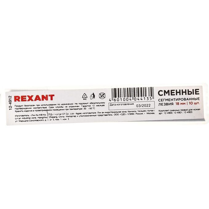 Комплект сменных сегментированных лезвий REXANT для ножей арт. 12-4900, арт. 12-4901, арт. 12-4903. Подходят для реза различных материалов: пластика, линолеума, кровельных материалов, гипсокартонных и гипсолитовых плит, бумаги, картона.