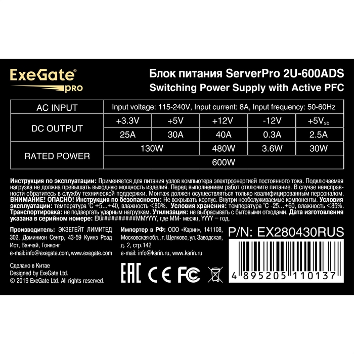 Серверный БП Exegate EX280430RUS 600W (ServerPRO-2U-600ADS) APFC, унив. для 2U, 24pin, 2*8pin, 5xSATA, 3xIDE