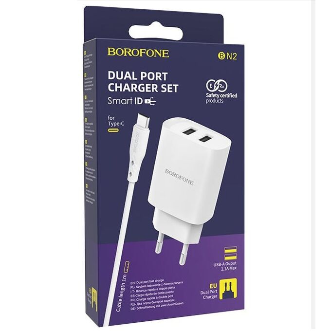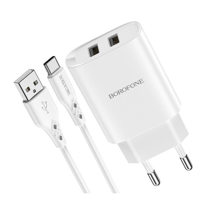 Сетевое зарядное устройство 2USB 2.1A в комплекте с дата-кабелем Type-C Borofone BN2 1м (White)