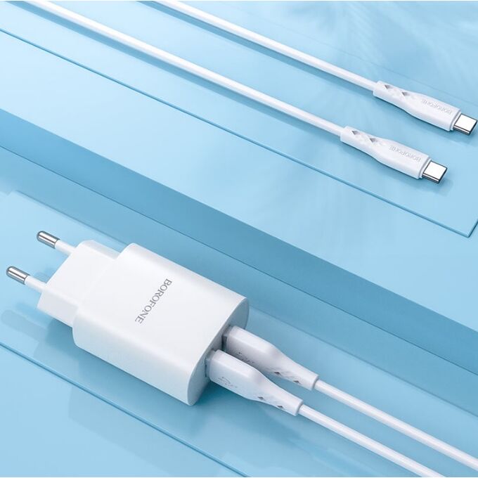 Cетевое устройство Borofone BN2 идет в комплекте с надежным кабелем Type-C.У набора приятный лаконичный дизайн в белом цвете. Для удобства в использовании, на коннекторах находятся ребристые вертикальные линии, благодаря им кабель не скользит в руках.Корпус сетевого устройства сделан из прочного пластика, который приятный на ощупь.Имеет защиту и интеллектуальная идентификационная ИС, благодаря им, зарядка любого гаджета будет безопасной.