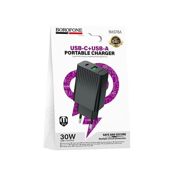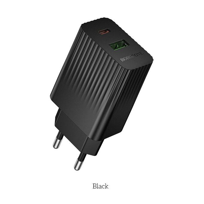 Сетевое зарядное устройство BOROFONE BAS76A/ СЗУ/ PD + QC 3.0/ 2 USB: Type-C 30W + Type-A 18W/ Выход общий: 15W/ Черный