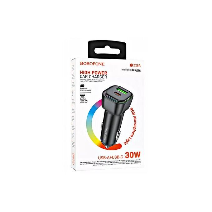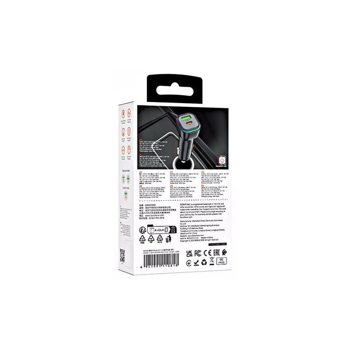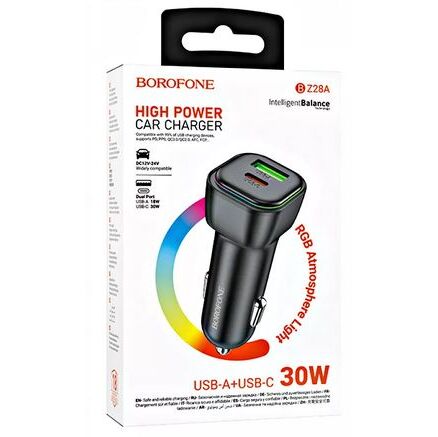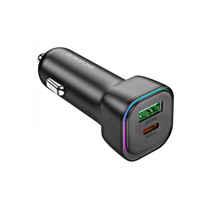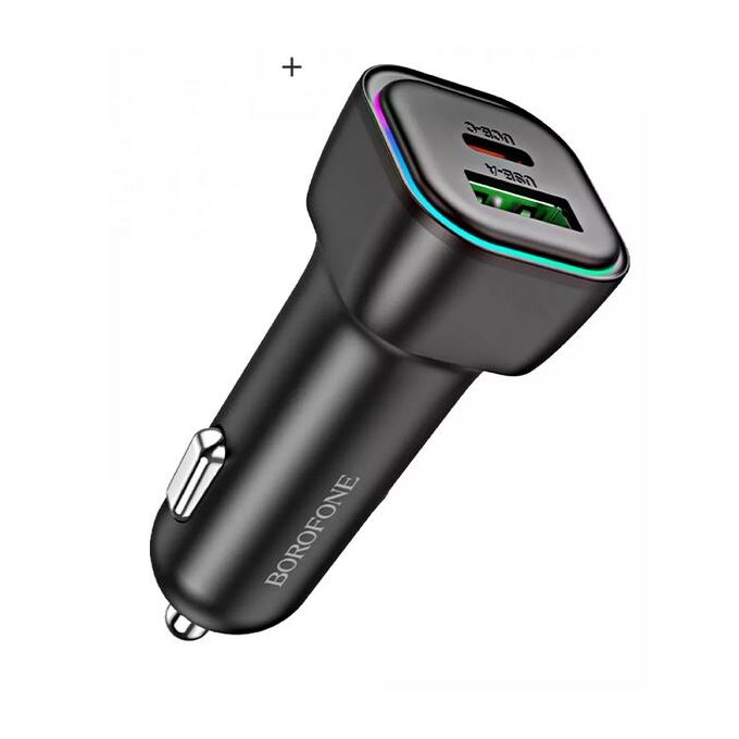 BOROFONE BZ28A - это мощное автомобильное зарядное устройство, которое имеет современный дизайн и два разъема для зарядки (USB и Type-C), поддерживающих технологии быстрого заряда QC3.0 и PD.