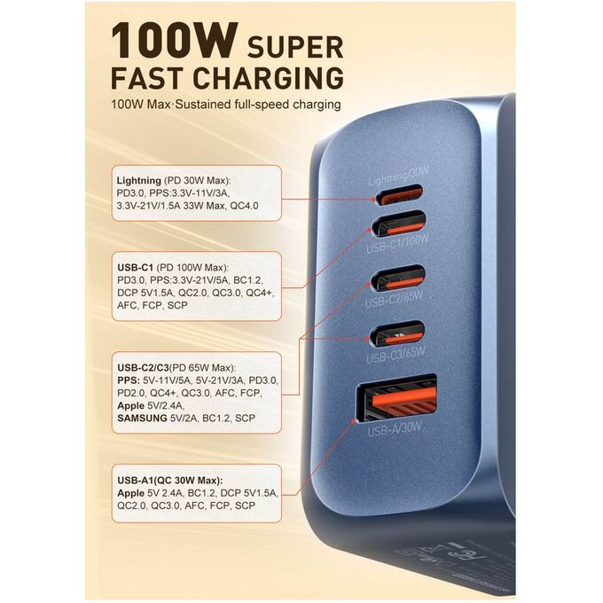 USB-C1+USB-C2+USB-C3+USB-A: 65W+5V/1.66A+5V/1.66A+5V/1.66A 9OW Max