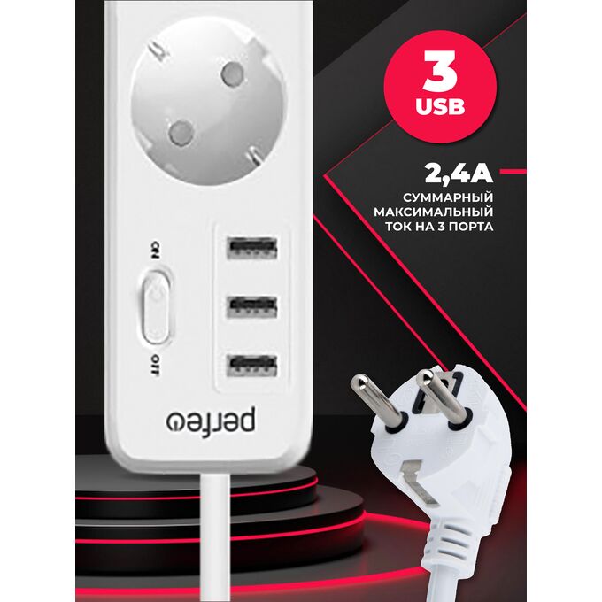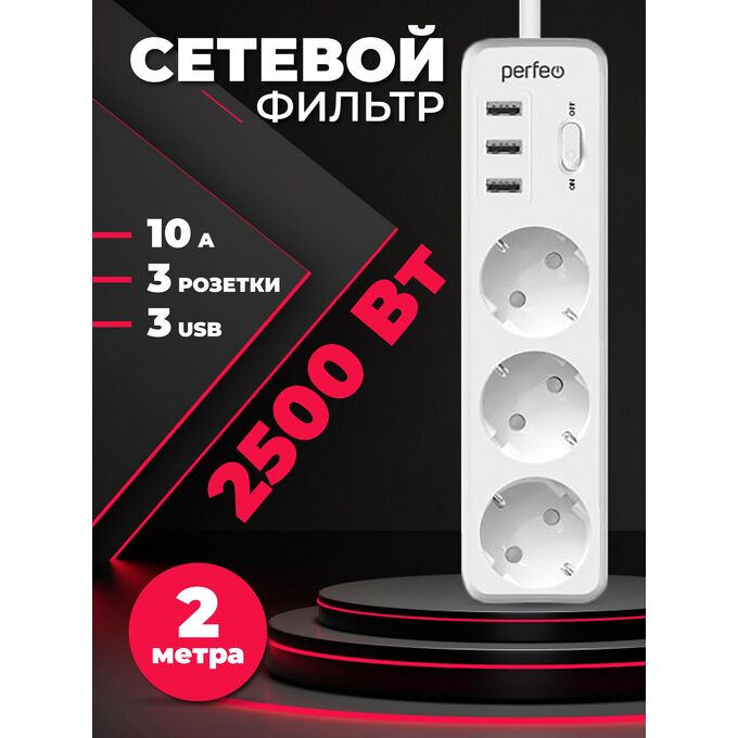 Сетевой фильтр Perfeo "POWER STREAM", 2500W, двойная защита, 2м, 3 розетки, 3 USB, белый.