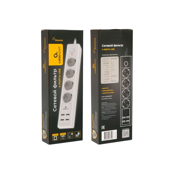 Технические характеристики Cablexpert exnovo 4р, 16а, 4хusb, 3.4a, 2м, ур.защиты 4+, белый, коробка EXN-4-U4-W-2