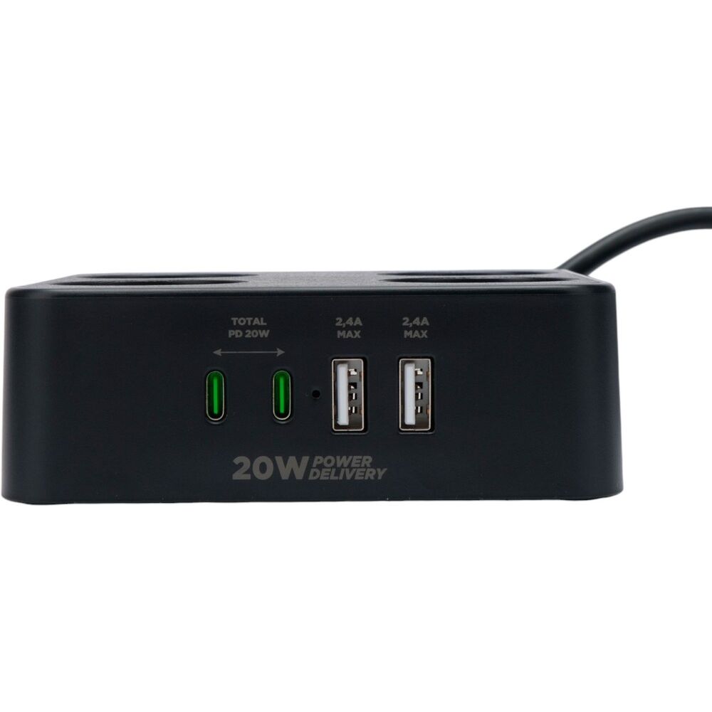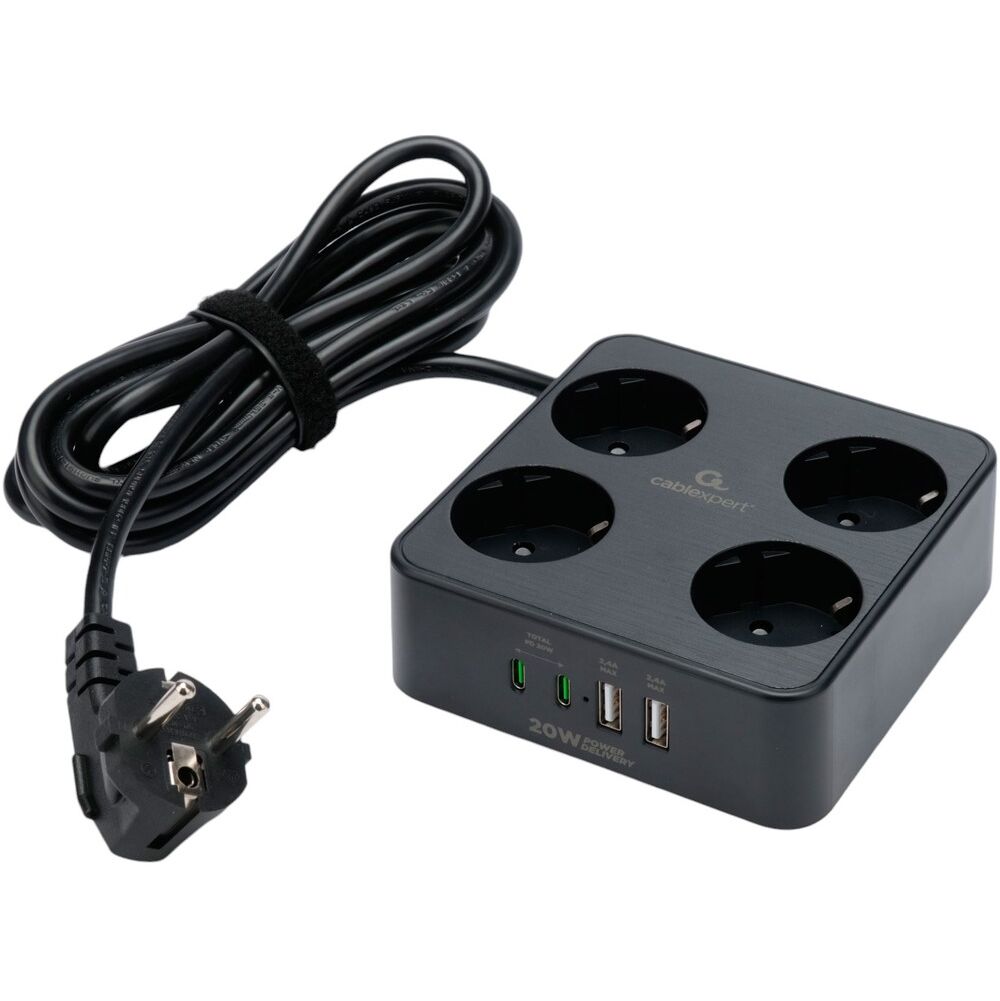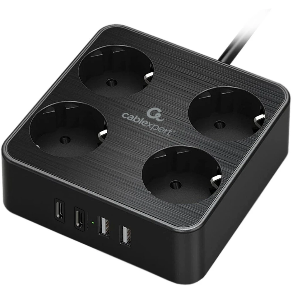 Сетевой фильтр Cablexpert PLT-4-C2U2-B-3 Plate 4р, 10А, 2xType-C PD, 20Вт, 2xUSB, 3м, ур.защиты 4+, черный, коробка