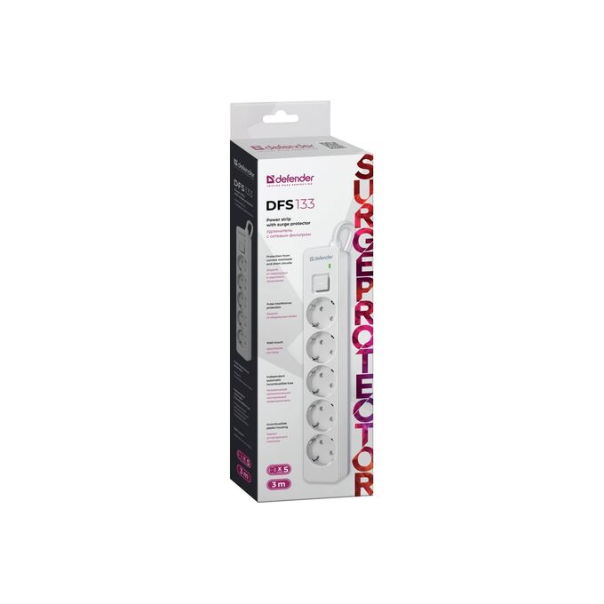 Удлинитель DEFENDER с сетевым фильтром DFS 133 3 м, белый, 5 розеток (99431)