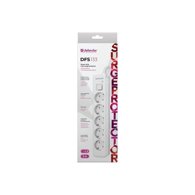 Сетевой фильтр DEFENDER с сетевым фильтром DFS 133 3 м, белый, 5 розеток (99431)