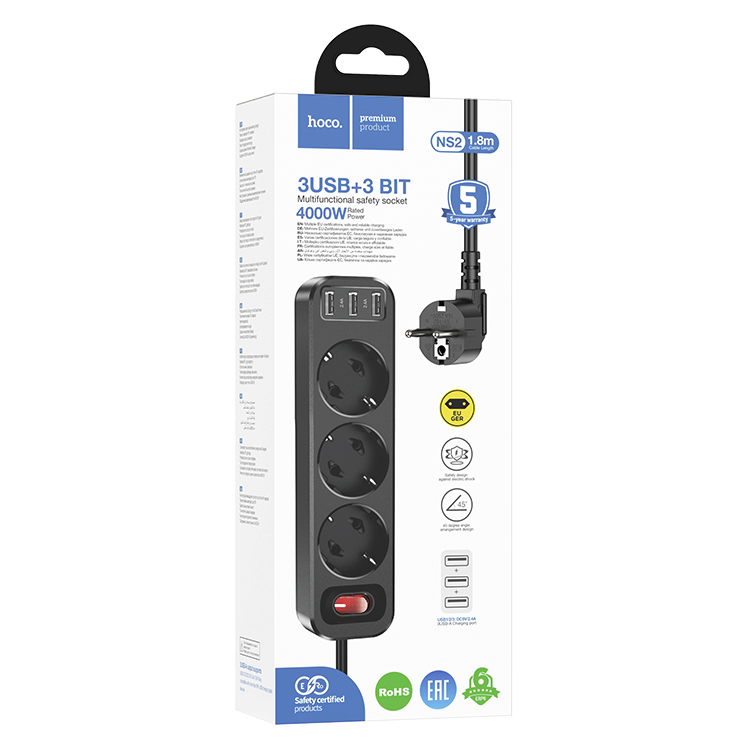 Огнестойкий материал, 3 розетки, 4000 Вт высокой мощности (вилка: в соответствии с немецкими/французскими/европейскими стандартами). 3 выходных порта USB-A: 5 В/2,4 А. Шнур питания: длина = 1,8 м. Размер: 197*58*40 мм, общий вес: 421 г.