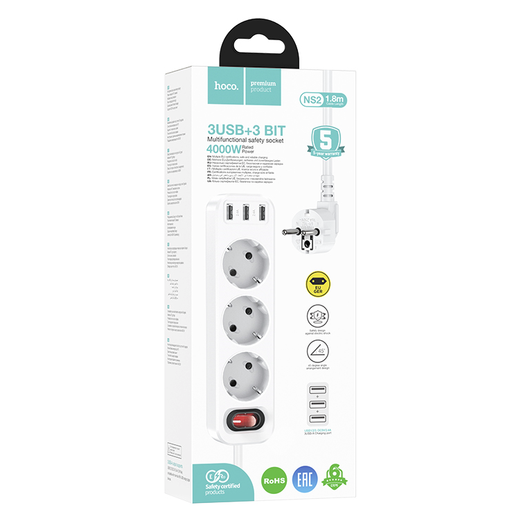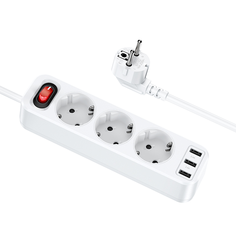 Огнестойкий материал, 3 розетки, 4000 Вт высокой мощности (вилка: в соответствии с немецкими/французскими/европейскими стандартами). 3 выходных порта USB-A: 5 В/2,4 А. Шнур питания: длина = 1,8 м. Размер: 197*58*40 мм, общий вес: 421 г.