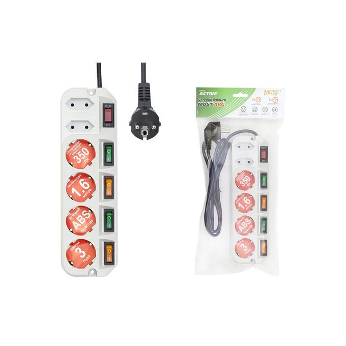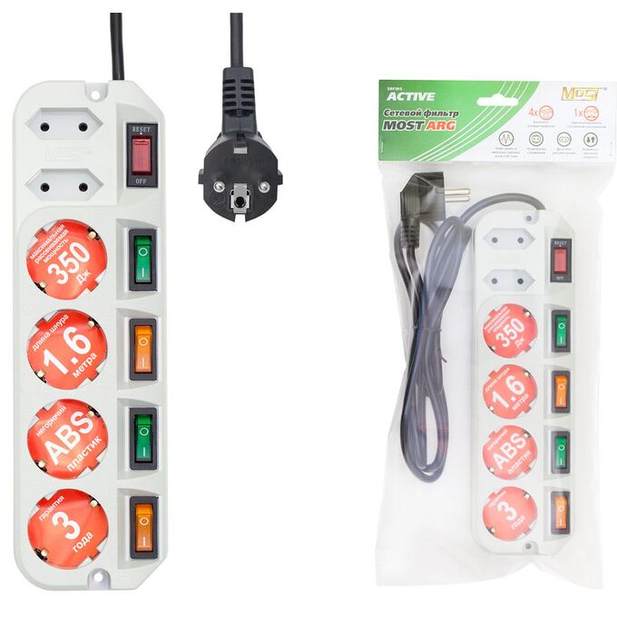 длина шнура: 3м, входная вилка: EURO, номинальная мощность: 2200ВA, индивидуальные выключатели розеток