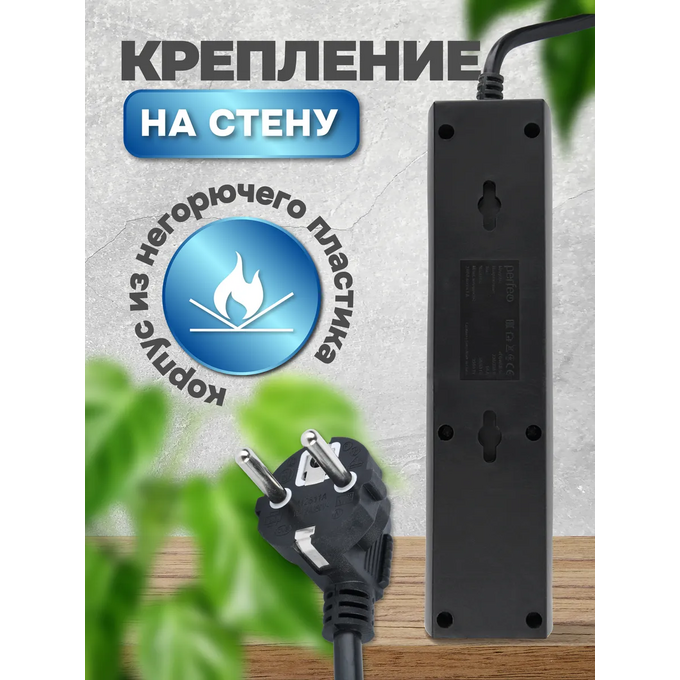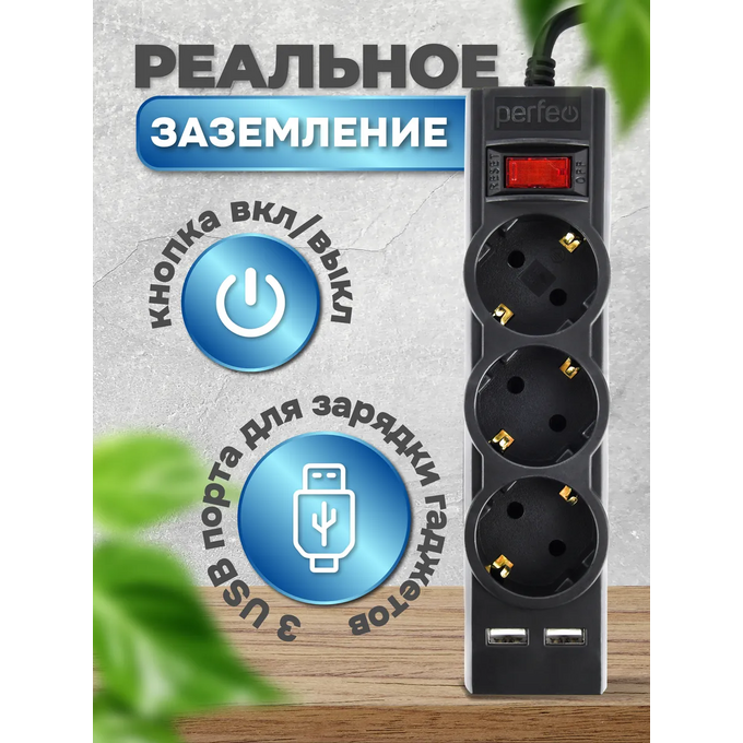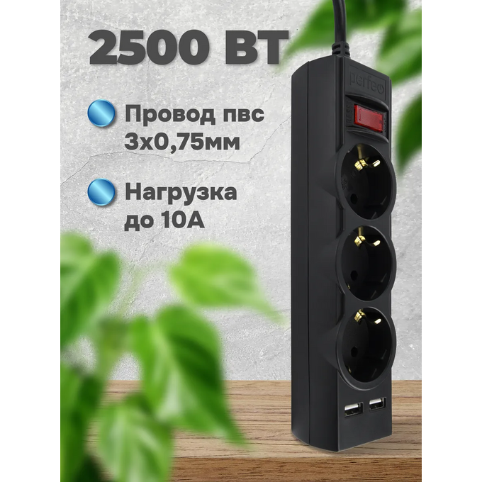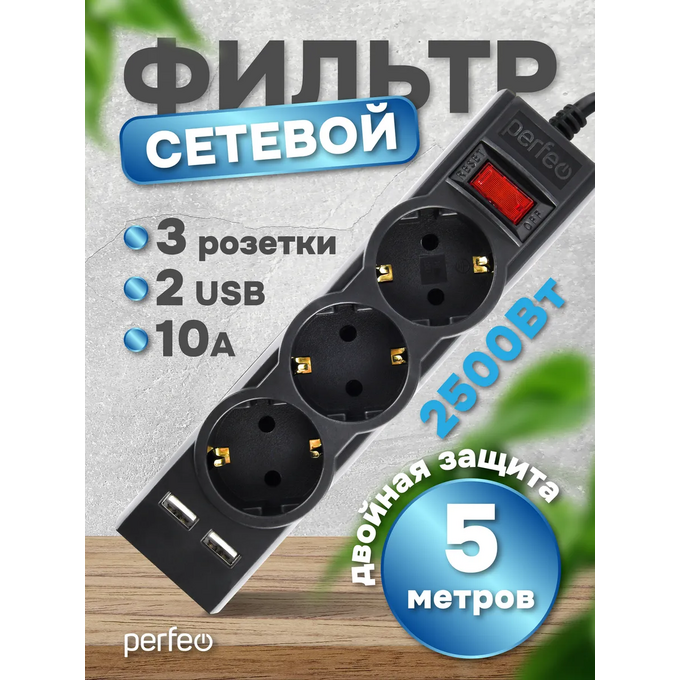 Сетевой фильтр Perfeo "POWER-S", 5,0м, 3 розетки 10А, 2USB, 2500 Вт, двойная защита, черный