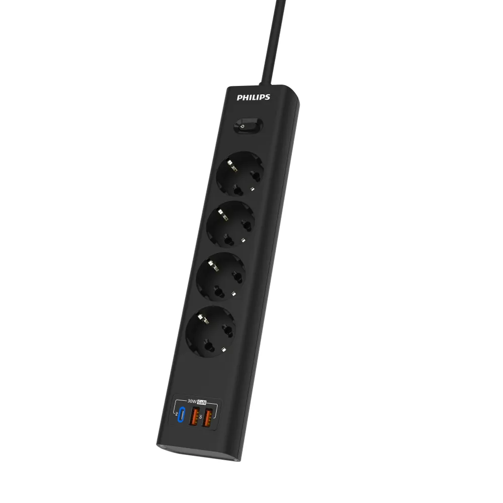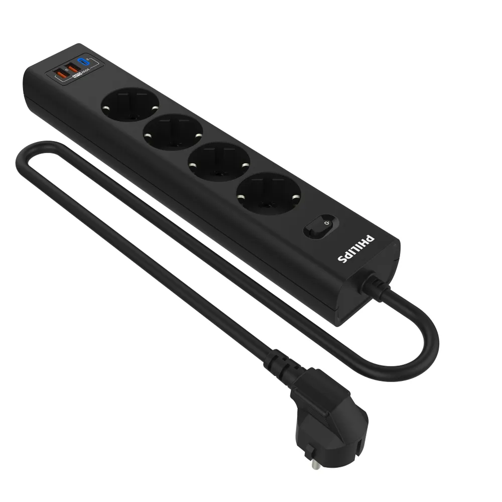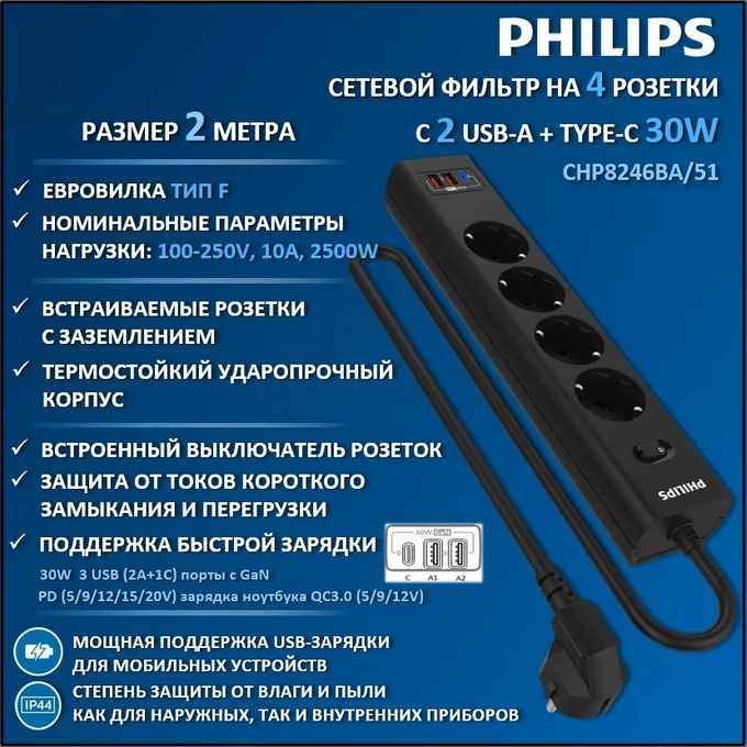 Сетевой фильтр удлинитель Philips CHP8246BA/51 представляет собой удобное устройство, которое позволяет подключать несколько устройств к одной розетке. Этот пилот удлинитель оснащен 4 розетками и 2 USB-А, а также одним портом Type-C, что обеспечивает возможность подключения различных электронных устройств, можно использовать как фильтр для компьютера, а также хорошо подойдет как удлинитель для гирлянды, поэтому он является многофункциональным. Длина разветвителя электрического составляет 2 метра, что позволяет свободно располагать подключенные устройства в нужном месте. Важным преимуществом розетки с выключателем является наличие заземления, которое обеспечивает безопасность и защиту от перегрузок. Тройник с usb 3.0 обладает многофункциональностью, позволяя подключать не только электрические приборы, но и заряжать устройства с помощью USB-портов. Сетевой фильтр Philips обладает передовой технологией быстрой зарядки QC 3.0 - Смартфон непрерывно посылает зарядному устройству информацию о состоянии аккумулятора. На основании этой информации блок питания регулирует выходную мощность, изменяя напряжение и силу тока. Также, благодаря новейшей технологии GaN, этот удлинитель предлагает высокую мощность, занимая при этом минимум места. Сетевые зарядные устройства, в которых используется технология GaN (нитрид галлия), потребляют меньше электрических компонентов и обладают лучшей теплоотдачей. Черный цвет разветвителя с type c придает ему стильный и современный вид, а прочный корпус обеспечивает долговечность и надежность использования. Этот удлинитель силовой идеально подходит для использования дома или в офисе, где требуется подключение и зарядка сразу нескольких устройств. Идеально подойдет для использования дома, гаража, склада, офиса.
