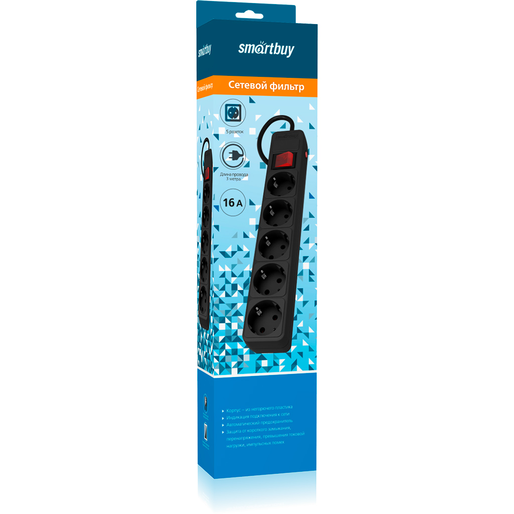 Сетевой фильтр Smartbuy SBSP-5-30-K 16А, 3500 Вт, 5 гнезд, без з/ш, с з/к, ПВС 3x1.0мм?, 3м, черный