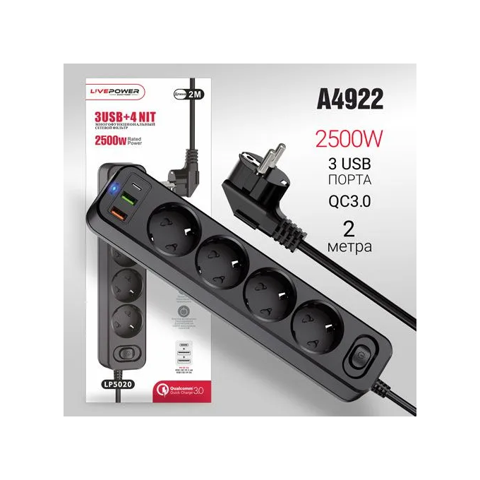 Сетевой фильтр-удлинитель Live-Power LP5020 PD20W+2USB+QC3.0 + 4 розетки 2000mm Black