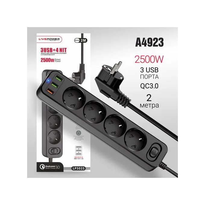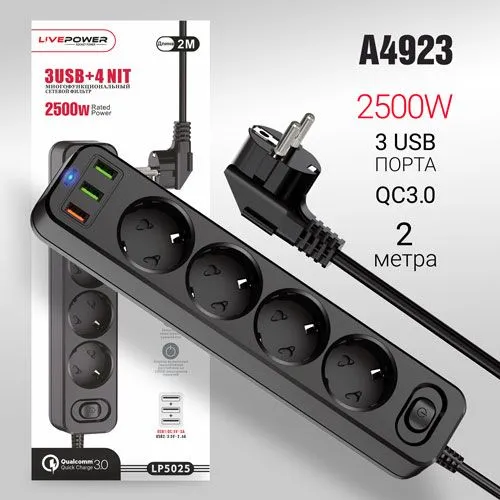Сетевой фильтр-удлинитель Live-Power LP5025 3USB+QC3.0 + 4 розетки 2000mm Black