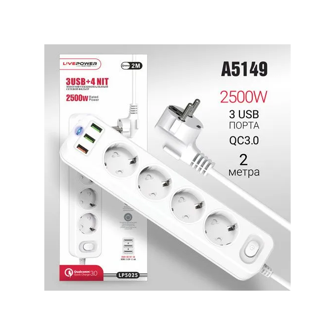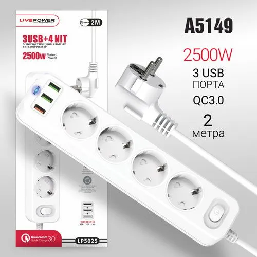 Сетевой фильтр-удлинитель Live-Power LP5025 3USB+QC3.0 + 4 розетки 2000mm White