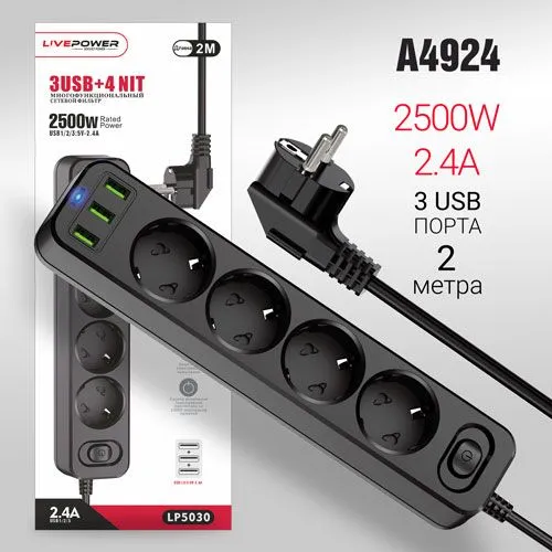 Сетевой фильтр-удлинитель Live-Power LP5030 3USB + 4 розетки 2000mm Black