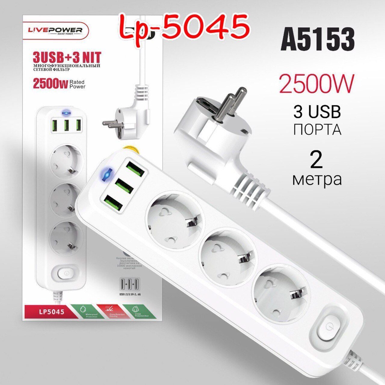 Сетевой фильтр-удлинитель Live-Power LP5045 3USB + 3 розетки 2000mm White