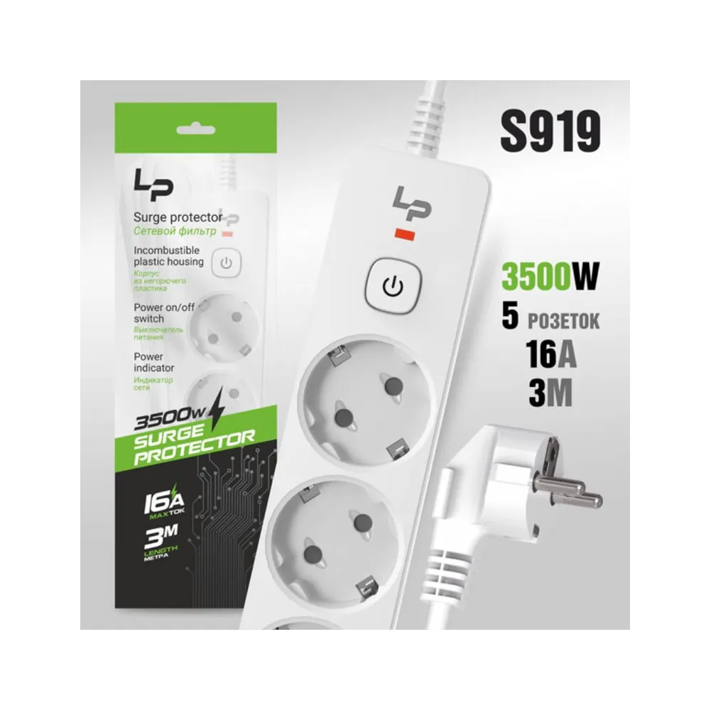 Сетевой фильтр-удлинитель Live-Power LP5140 5розеток С/З 16А с выкл. 3м white