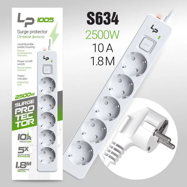 Сетевой фильтр-удлинитель LP LP1005 5розеток С/З 10А с выкл. 1.8м white