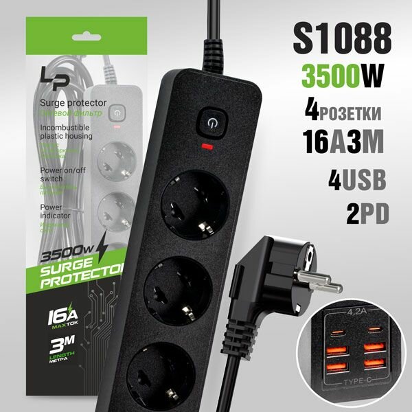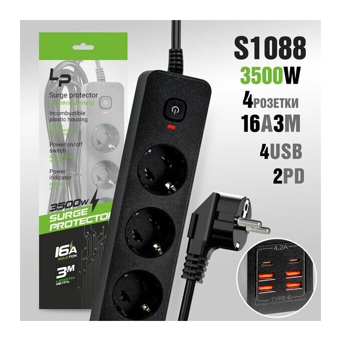 Сетевой фильтр-удлинитель LP LP1016 4розетки С/З 4USB + 2PD 16A с выкл. 3м black