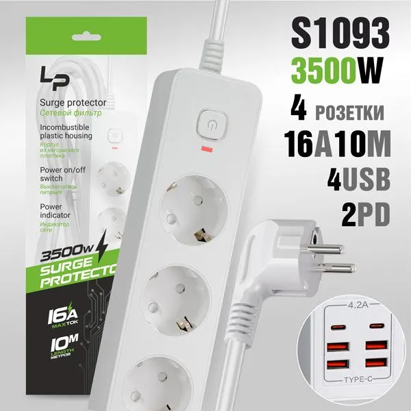Сетевой фильтр-удлинитель LP LP1018 4розетки С/З 4USB + 2PD 16A с выкл. 10м white