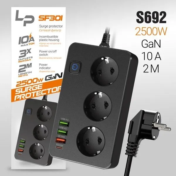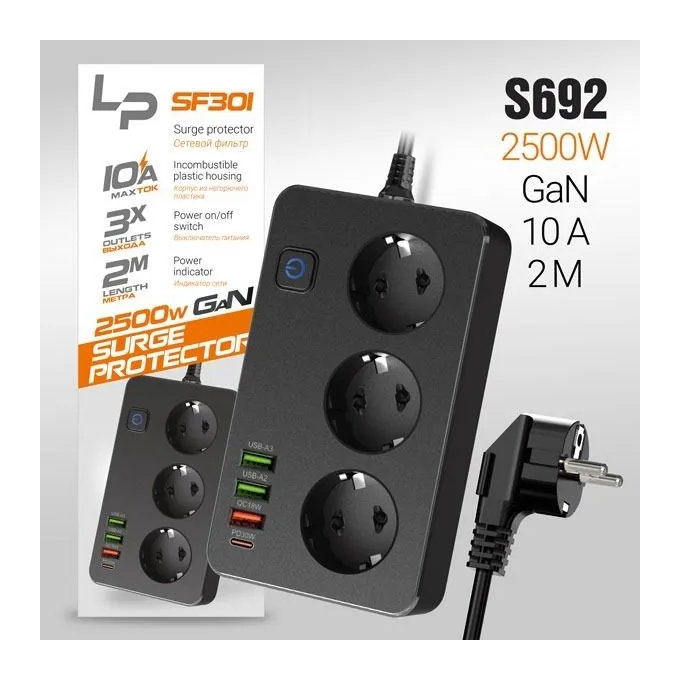 Сетевой фильтр-удлинитель LP SF301 3розетки 3USB A+C Gan 45W/10А 2500W 2м black