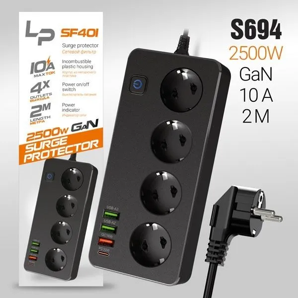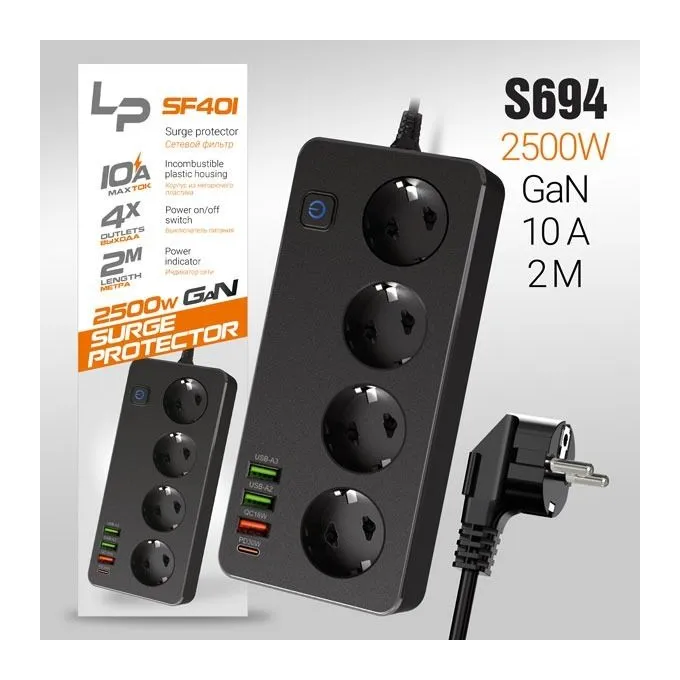 Сетевой фильтр-удлинитель LP SF401 4розетки 3USB A+C Gan 45W/10А 2500W 2м black