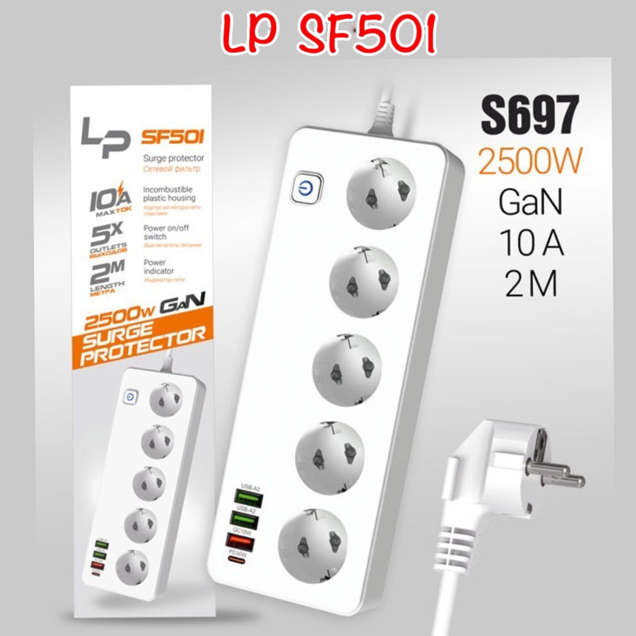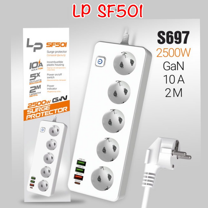 Сетевой фильтр-удлинитель LP SF501 5р 3USB A+C Gan 45W/10А 2500W 2м white