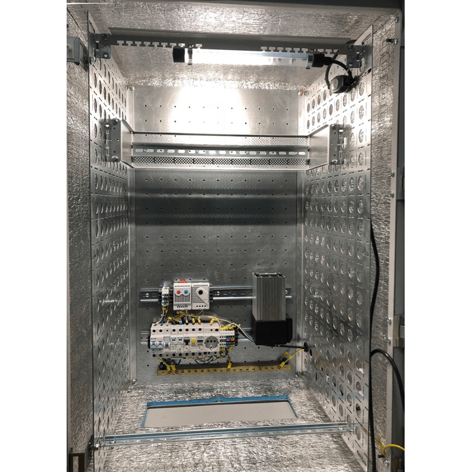 шкаф, нагреватель полупроводниковый, разрядник перенапряжения, индикатор напряжения, гигростат, термостат, выключатель дифференциальный защитный, выключатель автоматический, датчик открытия двери, розетка на DIN-рейку, шина заземления