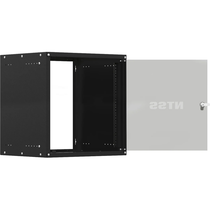 Компактный разобранный настенный шкаф NTSS серии «W» с передней дверью, открываемыми боковыми стенками на защелках, задней стенкой и панелями пола и потолка.
