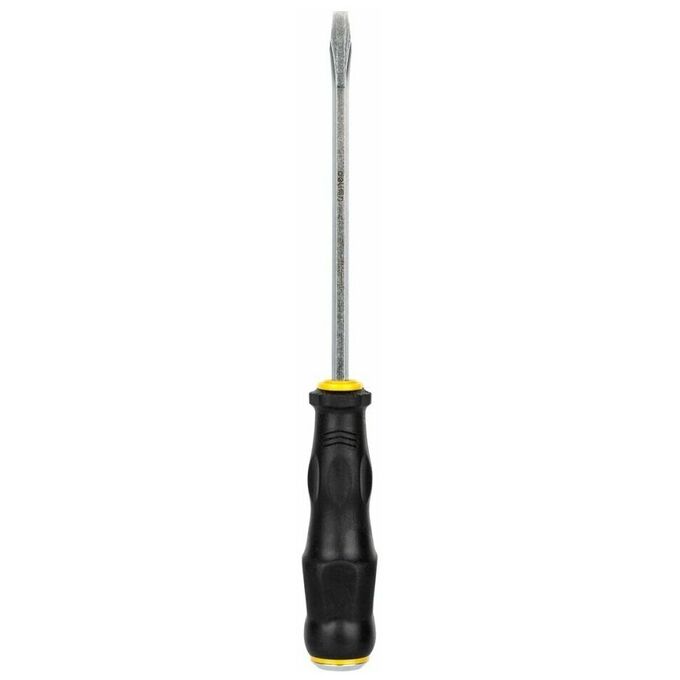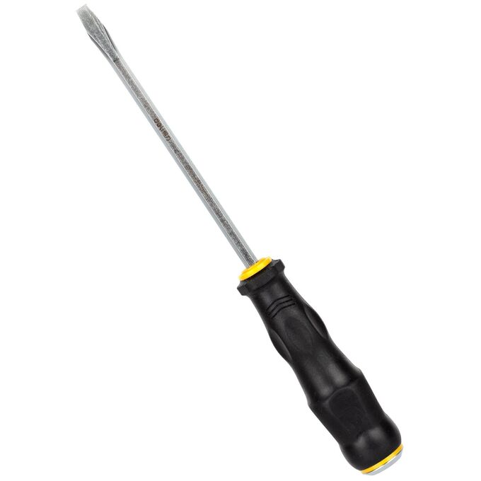 Ударная шлицевая отвертка со сквозным хвостовиком, используется для работ с резьбовыми соединениями в процессе ремонта или монтажа. Металлический затыльник рукоятки позволяет использовать инструмент вместе с молотком в процессе откручивания сложных винтов и гаек. Стержень выполнен из качественной хромованадиевой стали, что обеспечивает высокую антикоррозийную стойкость и долговечность.