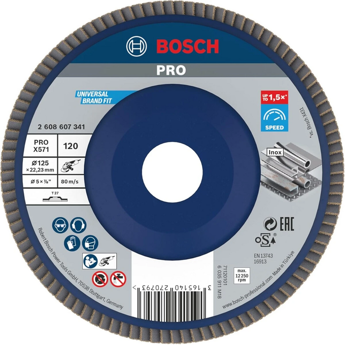 Лепестковый круг Bosch 2608607341 предназначен для угловых шлифовальных машин. Он изготовлен из прочной Х-ткани с высокоактивным покрытием, а связующим звеном является синтетическая смола. Абразивный материал данной оснастки — цирконовый корунд (корунд повышенной чистоты), это обуславливает высокую производительность съема. Круг с пластиковой прокладкой подходит для шлифования высококачественной и листовой стали, чугуна. Прямая форма оснастки подходит для обработки поверхностей и сварных швов под установочным углом 5-15º.