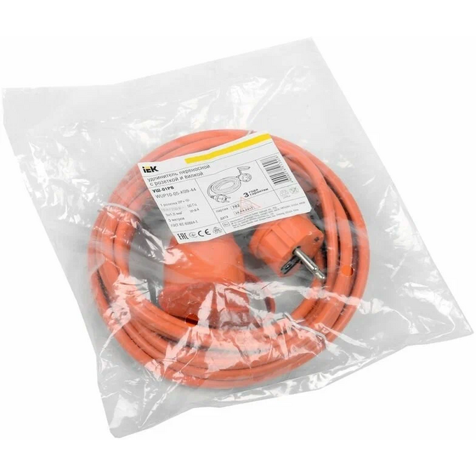 Шнур IEK УШ-01РВ (WUP10-10-K09-44) оранж. с вилкой и розеткой 2Р+РЕ/10 метров 3х1,0 мм2 IP44