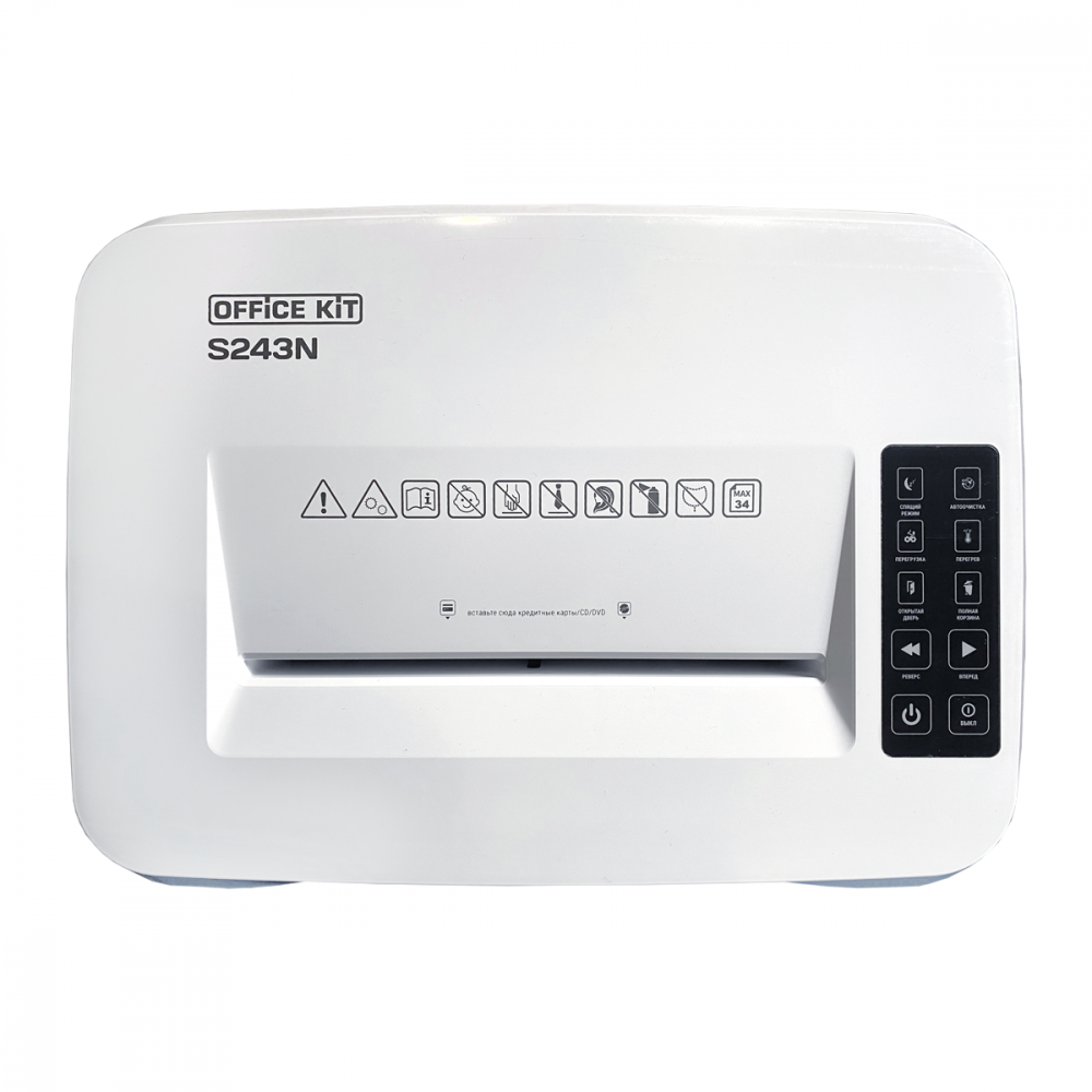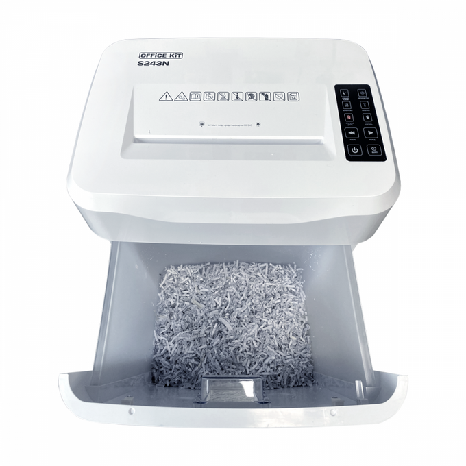 Шредер Office Kit S243N 3,9х38 белый (секр.P-4) фрагменты 35лист. 35лтр. скрепки скобы пл.карты CD