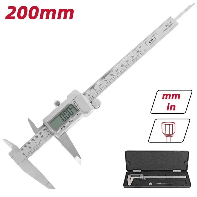 Штангенциркуль электронный Deli DL91200 200мм, метрическая/дюймовая конвертация, нерж, 3 кно