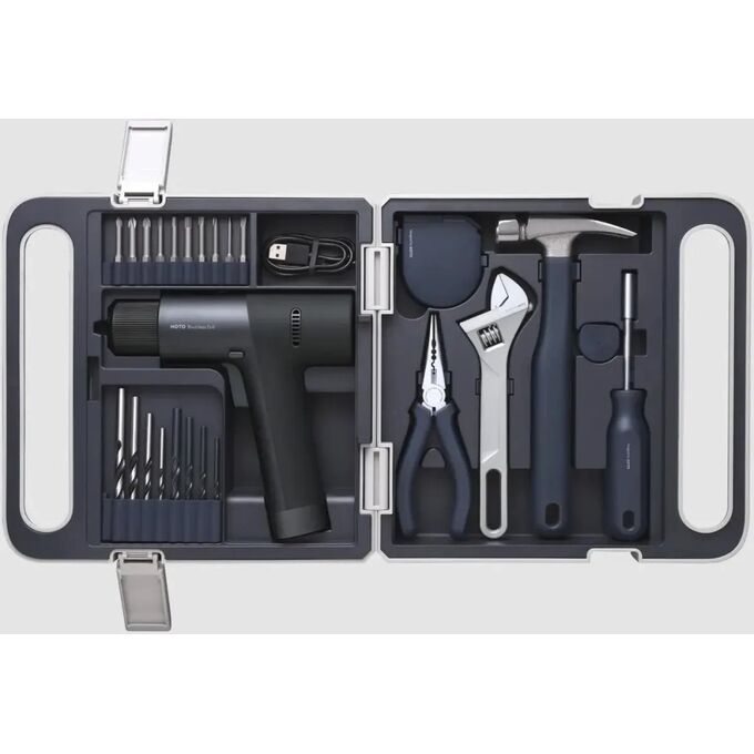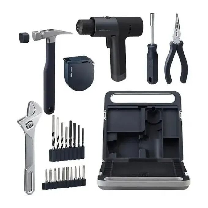 Дрель-шуруповерт, 10 бит из легированной стали S2, 4 сверла по дереву, 4 сверла по металлу, молоток с прорезиненной рукоятью, резиновый колпачок, измерительная лента 3 м. с системой автоблокировки, универсальные плоскогубцы с игольчатым наконечником, регулируемый гаечный ключ, зарядный кабель, кейс.