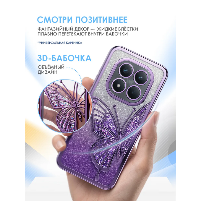 Главная деталь нашего защитного чехла - объемная 3D бабочка. Внутри ее прозрачных крыльев - россыпь блесток с плавным переходом цвета! Они мерцают на солнце и в свете ламп, глиттер заставляет чехол-бабочку светиться изнутри.
