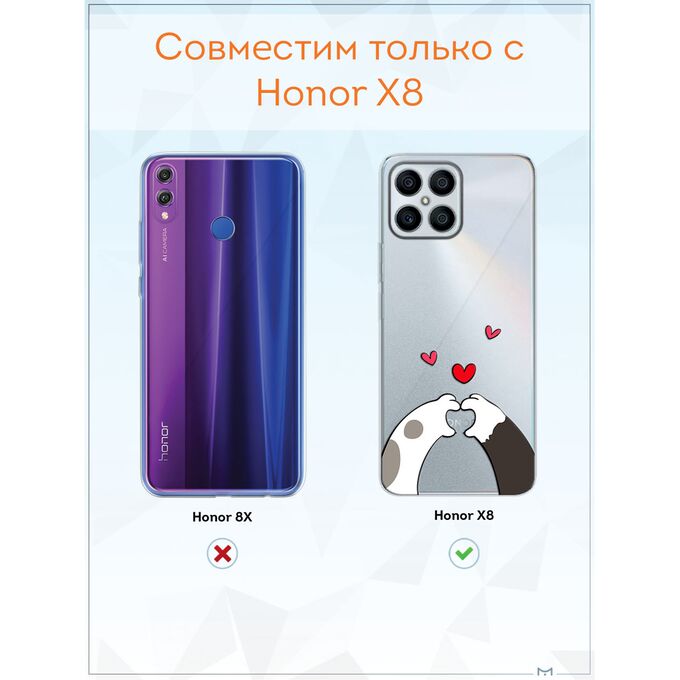 Чехол для смартфона Honor X8 - неотъемлемый аксессуар каждого современного человека. Премиальные износостойкие краски и лаки, качественные материалы изделия, японское оборудование и контроль качества производства - это то, что позволяет нам выгодно выделяться среди конкурентов и производить не только красивые, но тактильно приятные чехлы для Хонор Х8, которые долгое время не теряют первоначального вида.
