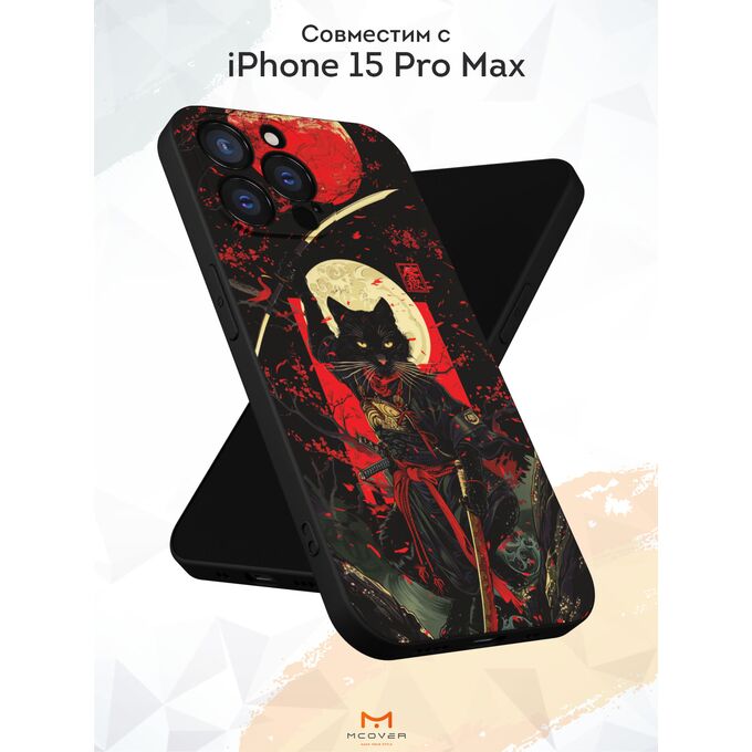 Силиконовый чехол Mcover для iPhone 15 Pro Max (Айфон 15 Про Макс), Кот-самурай