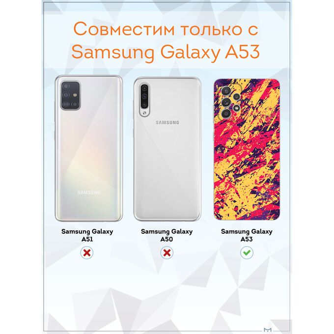 Чехол для смартфона Galaxy A53 5G - неотъемлемый аксессуар каждого современного человека. Премиальные износостойкие краски и лаки, качественные материалы изделия, японское оборудование и контроль качества производства - это то, что позволяет нам выгодно выделяться среди конкурентов и производить не только красивые, но тактильно приятные чехлы для Самсунг Галакси А53, которые долгое время не теряют первоначального вида.