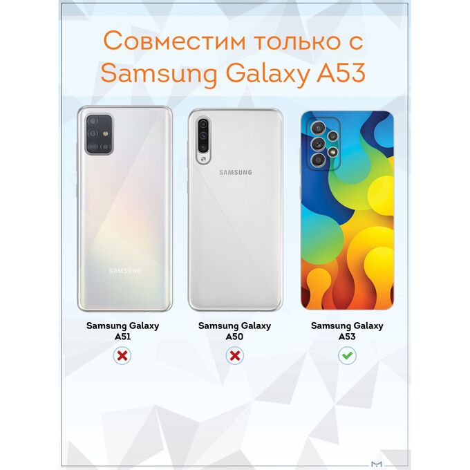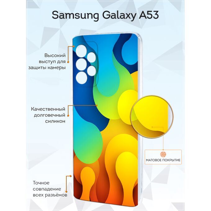 Чехол для смартфона Galaxy A53 5G - неотъемлемый аксессуар каждого современного человека. Премиальные износостойкие краски и лаки, качественные материалы изделия, японское оборудование и контроль качества производства - это то, что позволяет нам выгодно выделяться среди конкурентов и производить не только красивые, но тактильно приятные чехлы для Самсунг Галакси А53, которые долгое время не теряют первоначального вида.