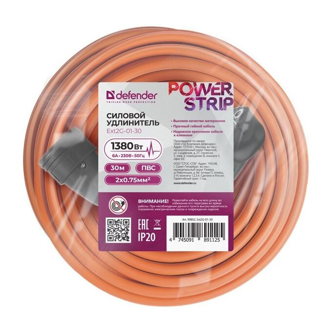 Силовой удлинитель DEFENDER Ext2G-01-30 (99852) 6А, 30м, без заземления