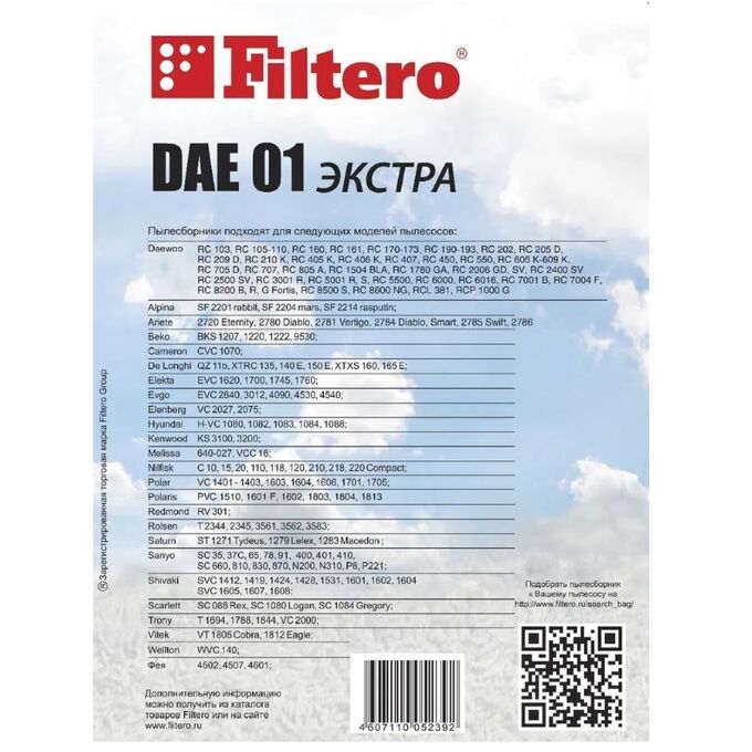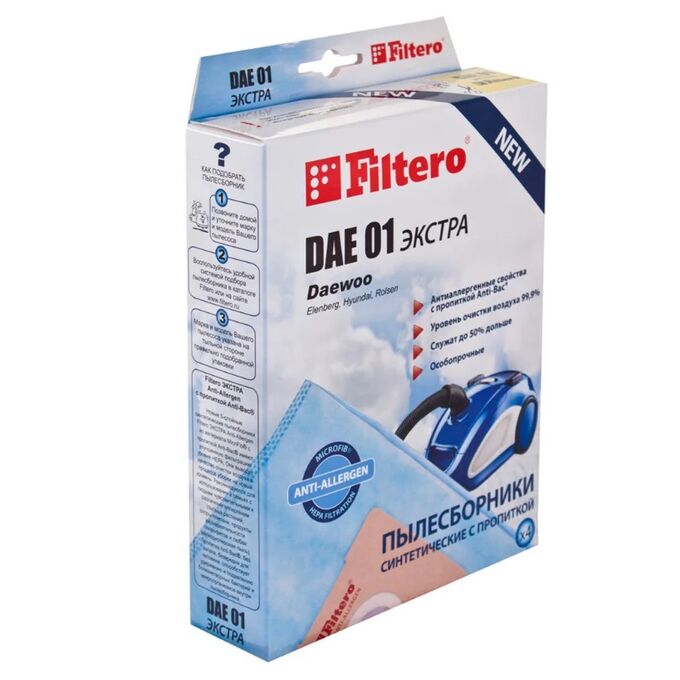 Пылесборник FILTERO DAE 01 (4) экстра. Мешки-пылесборники Filtero DAE 01 ЭКСТРА Anti-Allergen, 4 штуки. Пылесборники Filtero ЭКСТРА Anti-Allergen произведены из синтетического микроволокна MicroFib с антибактериальной пропиткой Anti-Bac. Очень прочные, они не боятся острых предметов и влаги, собирают больше пыли (до 50%) и обеспечивают уровень очистки воздуха 99,9%, а также задерживают бактерии и препятствуют их распространению. При этом мощность всасывания пылесоса сохраняется в течение всего периода службы пылесборника.