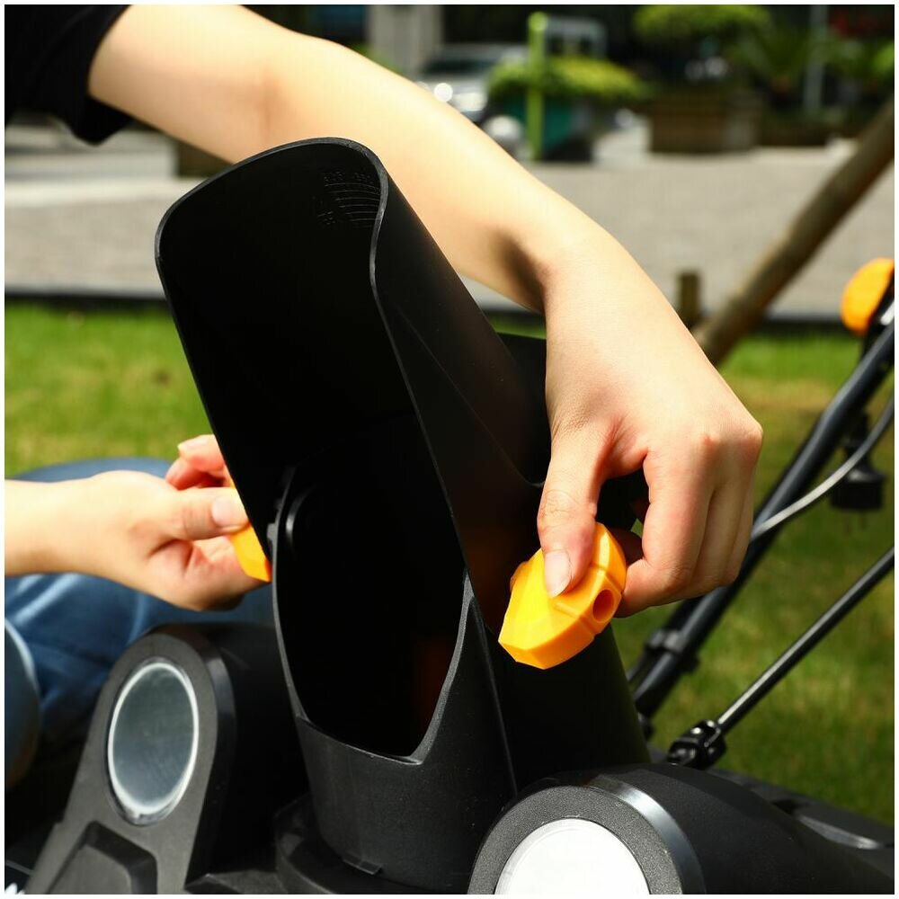 С помощью специальной рукоятки можно поворачивать желоб и осуществлять выброс снега в желаемом направлении. Снегоуборщик оснащен 2-мя фарами для работы в темное время суток.