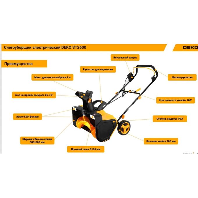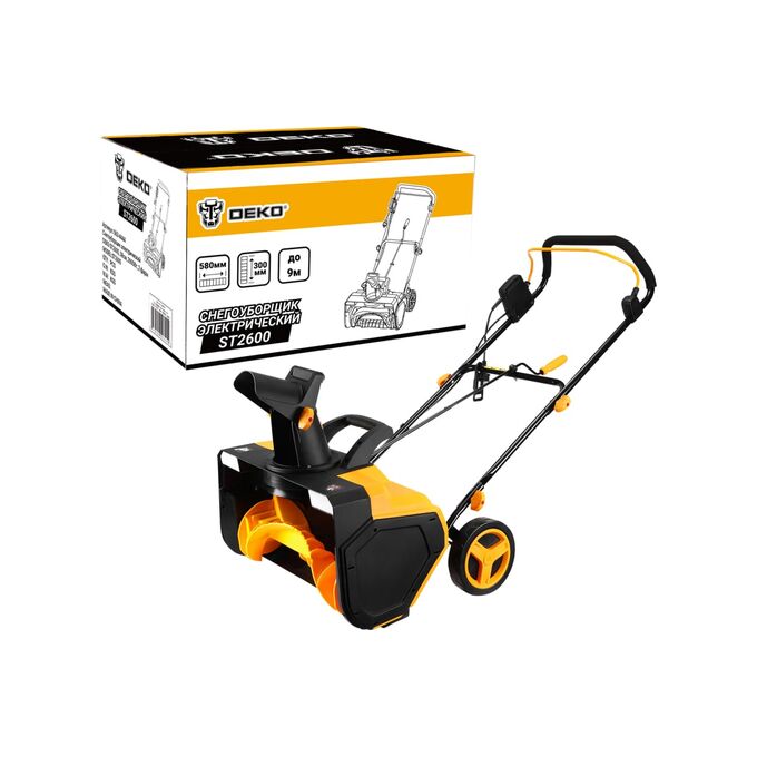 Электрический снегоуборщик DEKO ST2600, 58 см, 2600 Вт, 2 фары 063-4444 предназначен для садовых работ.