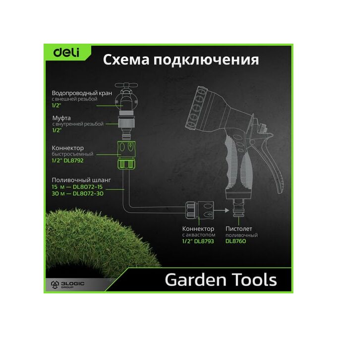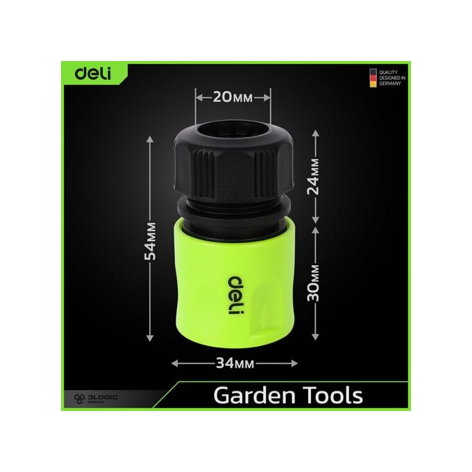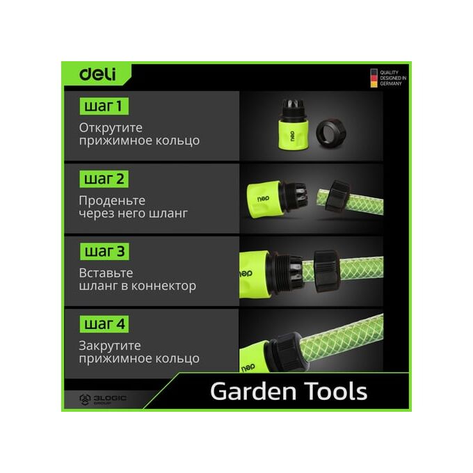 Коннекторы Deli обеспечивают легкое и быстрое подключение шланга к поливочному инструменту. Это экономит ваше время и упрощает процесс настройки системы полива. Благодаря простому и эффективному дизайну, вы сможете с легкостью подключить и отсоединить шланг, не тратя лишнего времени и усилий.