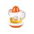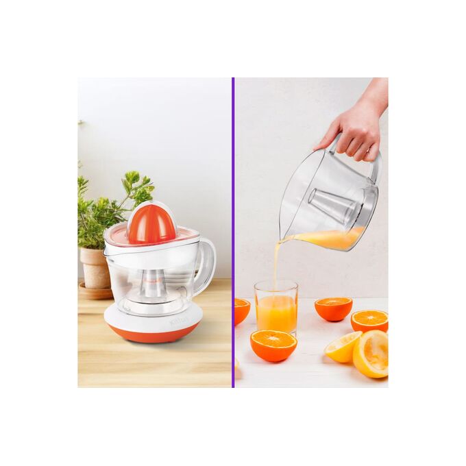 Чтобы привести соковыжималку в действие, нужно надавить плодом на конус для отжима сока, и конус начнет вращаться. Конус может вращаться в двух направлениях, что позволяет отжать из цитрусовых максимальное количество сока. Подача сока осуществляется контейнер для сока. На контейнер для сока нанесена мерная шкала. Благодаря наличию фильтра крупные куски и косточки не попадут в сок. Удобный носик и ручка лотка позволят аккуратно перелить сок в другую емкость.